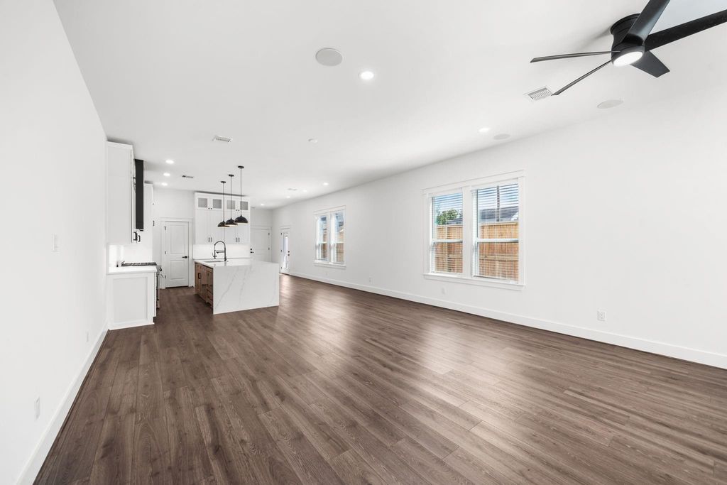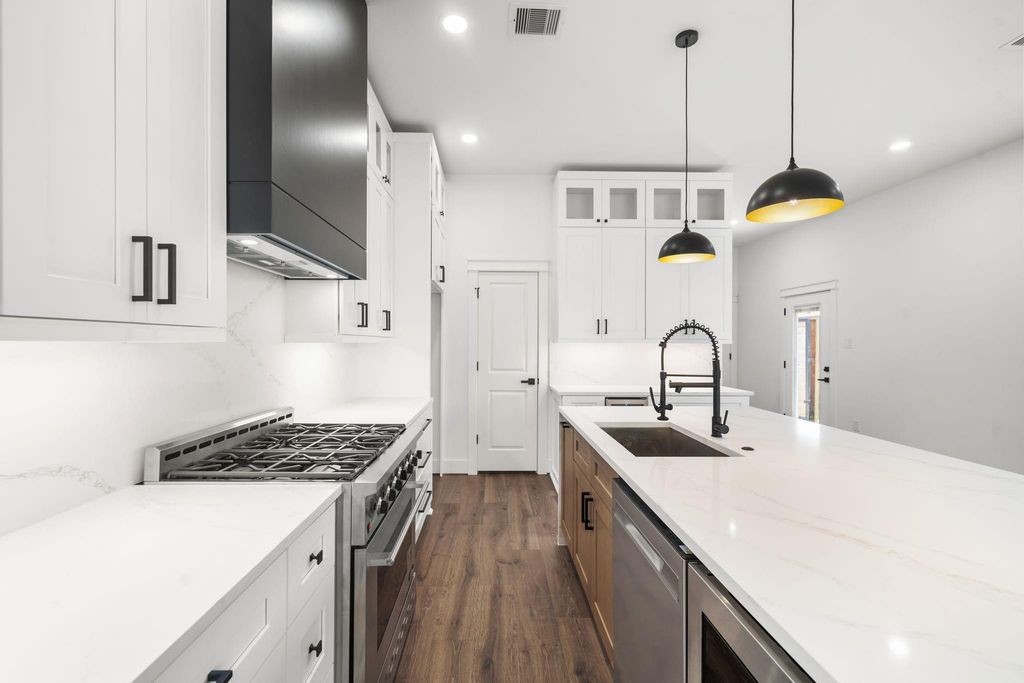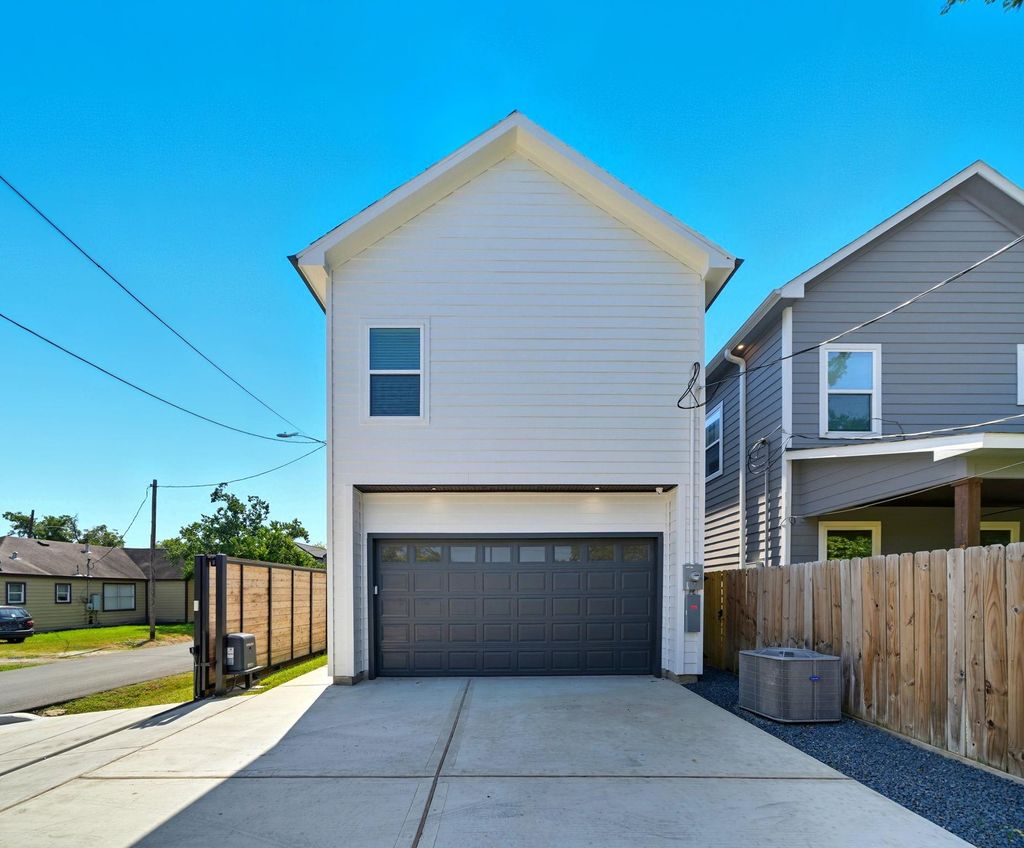 Beautifully designed new construction built by Brunson Home Builders completed and ready for move in situated on a spacious corner lot with easy freeway access. 10 foot ceilings throughout, open concept kitchen showcases quartz waterfall island, ceiling height cabinetry with under counter lighting and plugs, full quartz and custom vent hood, 36 inch commercial gas range, beverage and regular refrigerator. Powder room located off kitchen, waterproof laminate flooring throughout, security system with cameras, speakers in living area, high efficiency A/C, porcelain tile bathrooms are among the homes quality finishes. Primary suite offers spa like bath with soaking tub, separate shower and large custom walk in closet. Laundry room with stackable washer/dryer included. Balcony off primary suite and fenced grassy side yard, motorized driveway gate and additional parking enclosed with 7 foot privacy fence - ideal for relaxing or entertaining.
